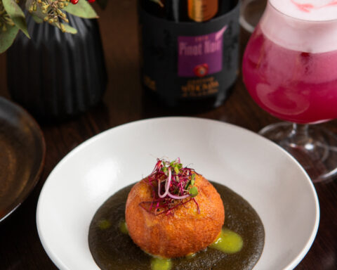 Molokhiyeh Arancini reinvents the classic molokhiyeh soup as risotto-filled chicken arancini, nestled in a vibrant mallow leaf sauce and finished with roasted
